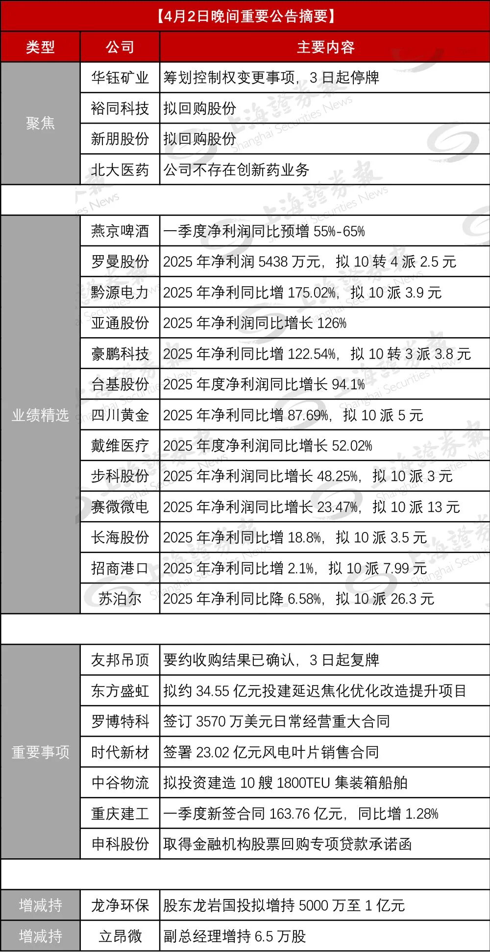 四川黄金:披露年报。公司2025年实现营业收入10.26亿元,同比增长60.38%;实现归属于上市公司股东的净利润4.66亿元,同比增长87.69%;基本每股收益1.11元。公司2025年度利润分配预案为:向全体股东每10股派发现金红利5元(含税)。