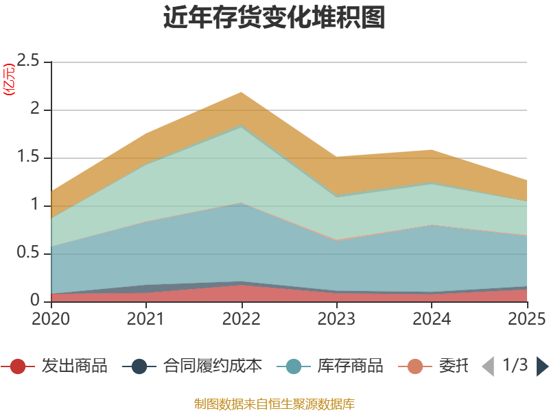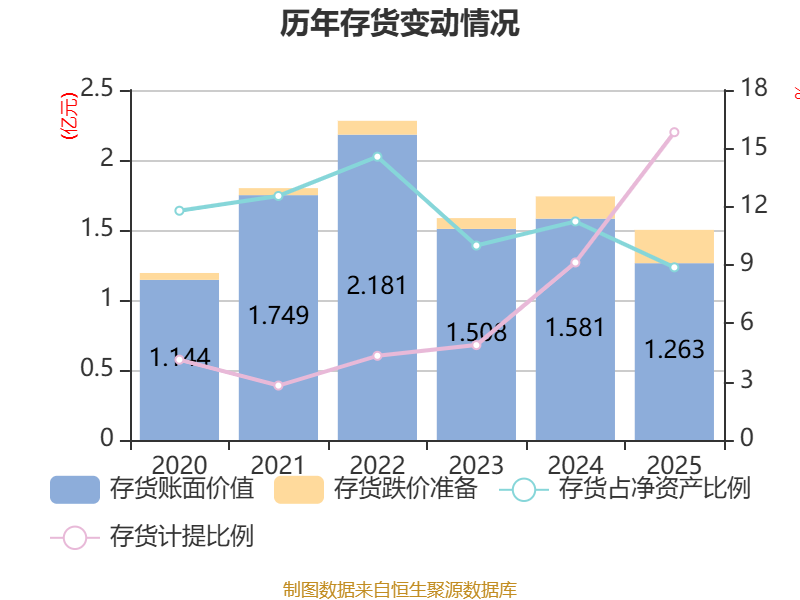 从存货变动来看,截至2025年末,公司存货账面价值为1.26亿元,占净资产的8.88%,较上年末减少3178.33万元。其中,存货跌价准备为2376.19万元,计提比例为15.83%。