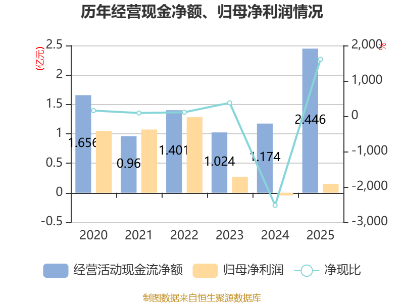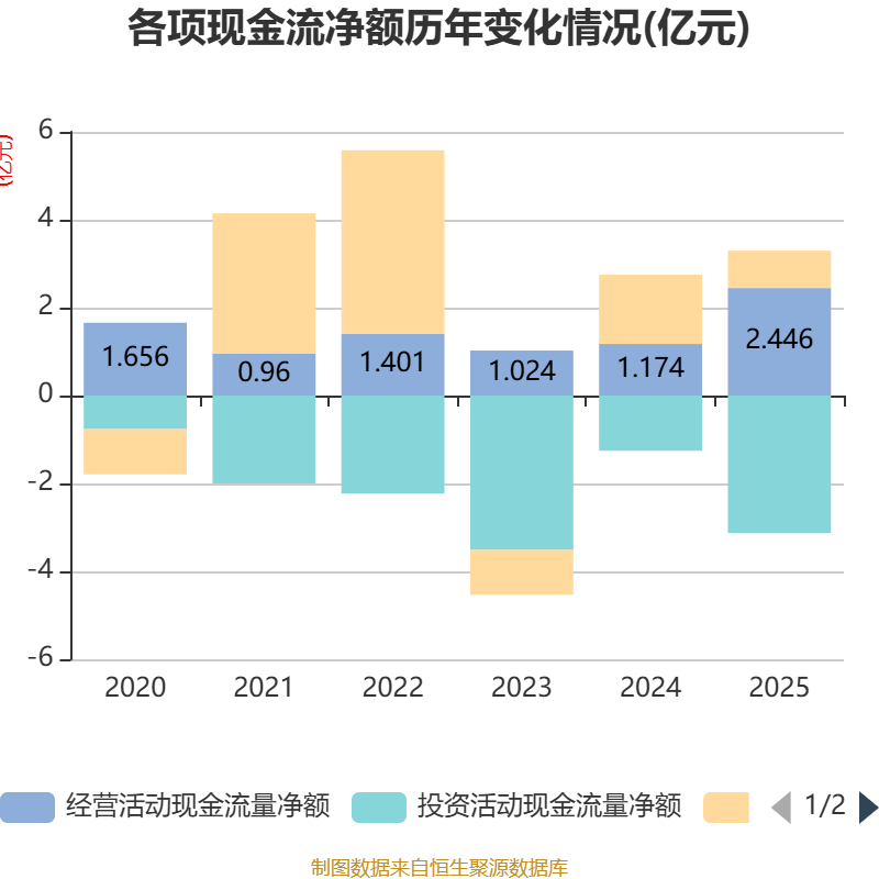 截至2025年,公司经营活动现金流净额为2.45亿元,同比增长108.4%;筹资活动现金流净额8501.08万元,同比减少7279.55万元;投资活动现金流净额-3.13亿元,上年同期为-1.26亿元。