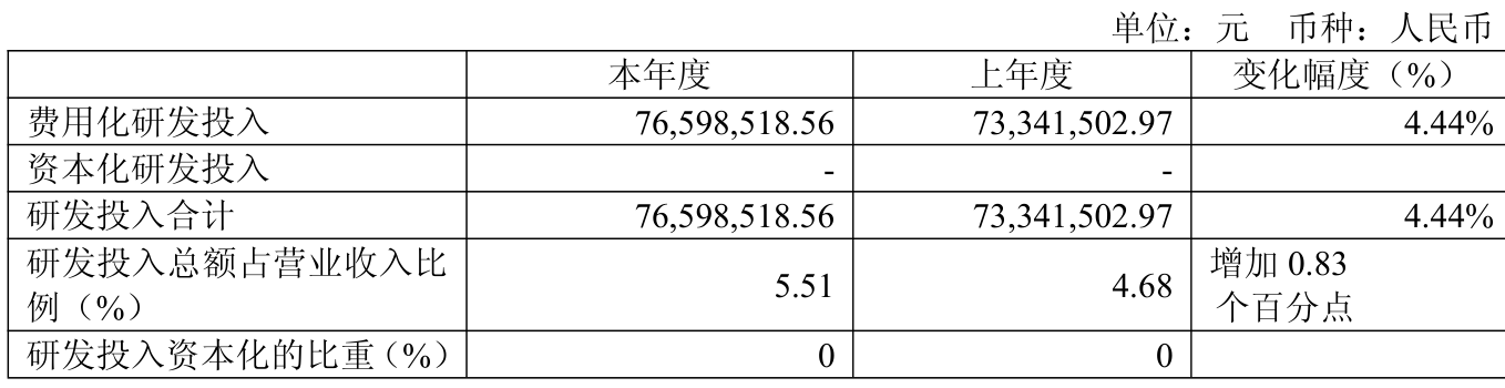 2025年全年,公司研发投入金额为7659.85万元,同比增长4.44%;研发投入占营业收入比例为5.51%,相比上年同期上升0.83个百分点。此外,公司全年研发投入资本化率为0%。
