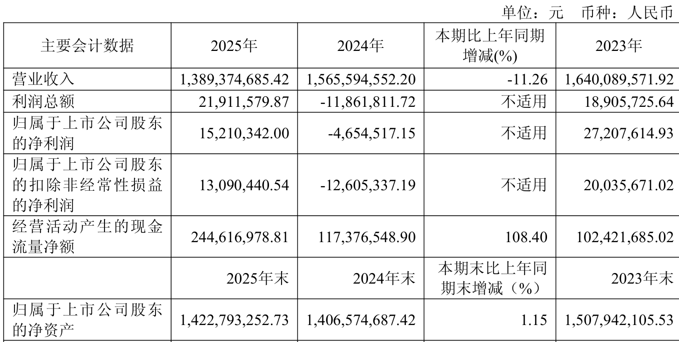 中证智能财讯富淼科技(688350)4月3日披露2025年年度报告。2025年,公司实现营业总收入13.89亿元,同比下降11.26%;归母净利润1521.03万元,同比扭亏;扣非净利润1309.04万元,同比扭亏;经营活动产生的现金流量净额为2.45亿元,同比增长108.40%;报告期内,富淼科技基本每股收益为0.13元,加权平均净资产收益率为1.08%。公司2025年度分配预案为:拟向全体股东每10股派现0.75元(含税)。