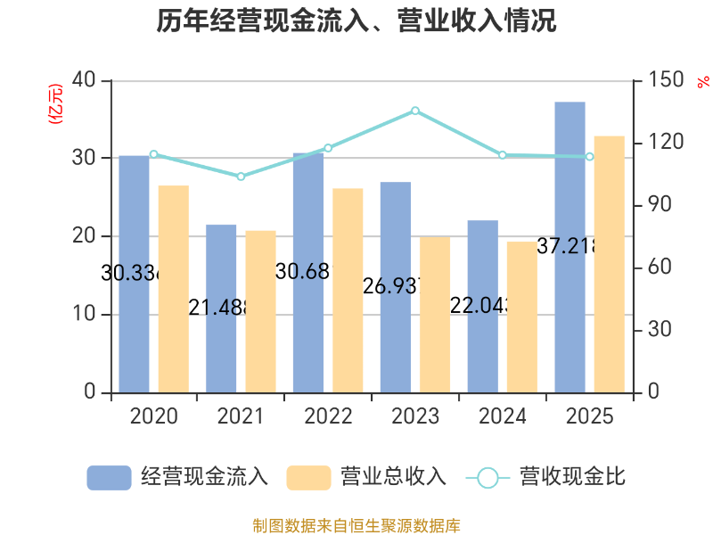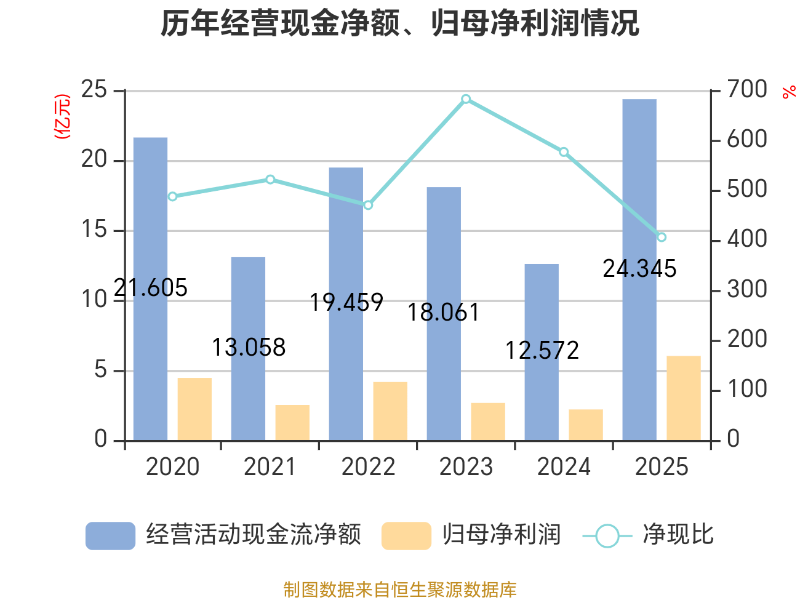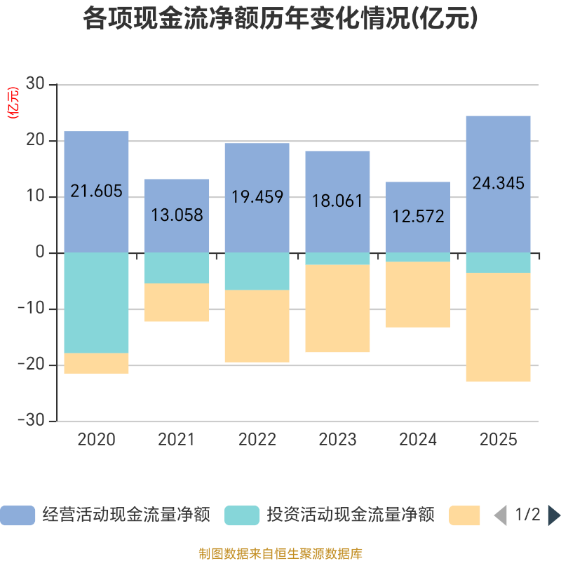 截至2025年,公司经营活动现金流净额为24.34亿元,同比增长93.63%;筹资活动现金流净额-19.4亿元,同比减少7.68亿元;投资活动现金流净额-3.63亿元,上年同期为-1.66亿元。
