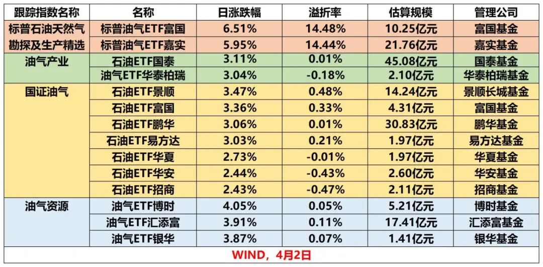特朗普一句话,这些ETF又“嗨了”!4月2日,多只标普油气相关ETF大涨,能源化工ETF、石油ETF等涨幅居前。