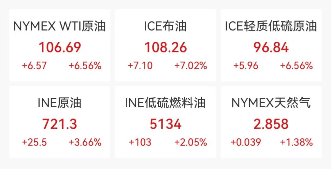 受此影响,国际油价大幅拉升,截至发稿,布油突破108美元/桶,WTI原油突破106美元/桶。