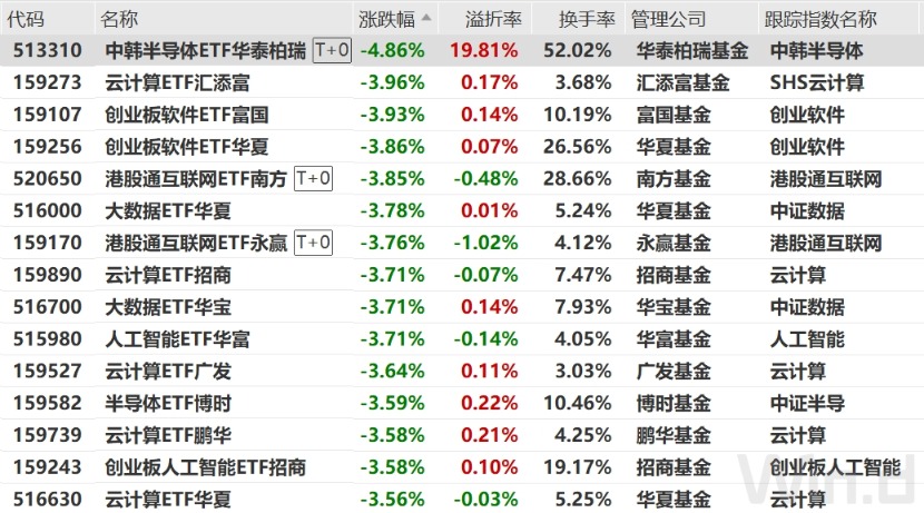 此外,中韩半导体ETF领跌,云计算ETF、创业板软件ETF等跌幅居前。