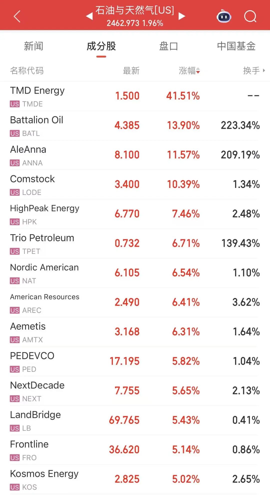 石油与天然气板块多股上涨,TMD Energy涨超40%,AleAnna、Battalion Oil、Comstock涨超10%。