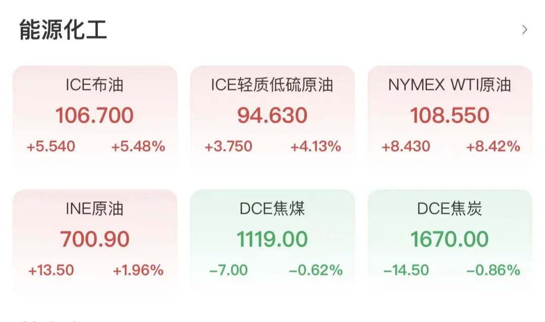 国际原油价格快速走低,WTI原油涨幅收窄至9%以内,此前涨超13%。截至发稿,WTI原油涨8.42%,报108.55美元/桶;布伦特原油涨5.48%,报106.7美元/桶。