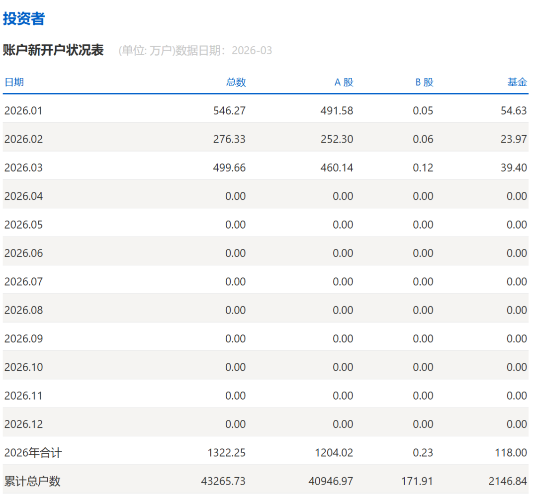 上交所数据显示,2026年3月A股新开户460.14万户,环比增长82.38%,同比增长50.10%。2026年累计新开1204.02万户,同比增长61.15%。
