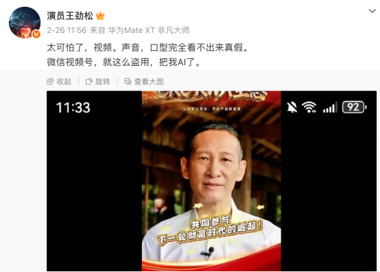 今年2月26日,演员王劲松发文称自己的形象被AI盗用生成视频,且生成视频声音、口型完全看不出来真假,直言“太可怕了”,并担心后续出现更真实、性质更恶劣的侵权AI视频。