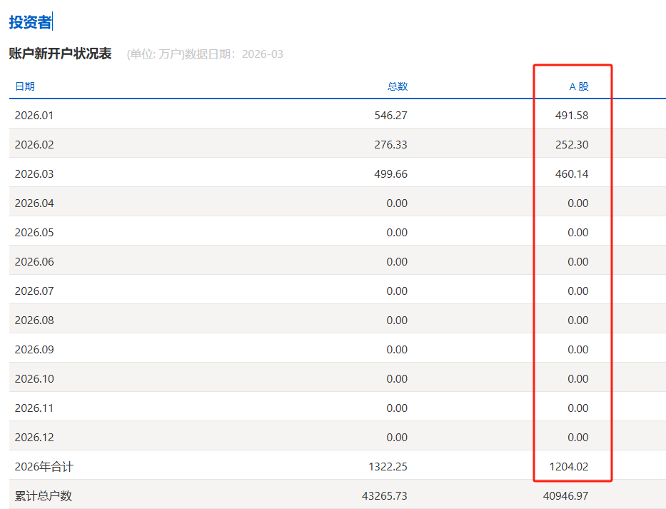 2026年开年以来,A股新开户数据呈现“高开、回落、再冲高”的走势:1月开户491.58万户,创近一年新高;2月受春节假期交易日减少影响回落至252.3万户;3月再度大幅回升至460.14万户,环比增长82.38%,显著扭转了2月的下滑颓势。