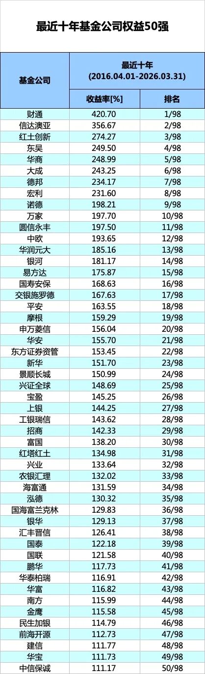 国泰海通证券数据显示,2016年4月1日至2026年3月31日,财通基金位居最近十年主动权益类基金绝对收益榜首:其最近十年主动权益基金平均单位净值增长率为420.70%,在98家基金公司中排名第一。
