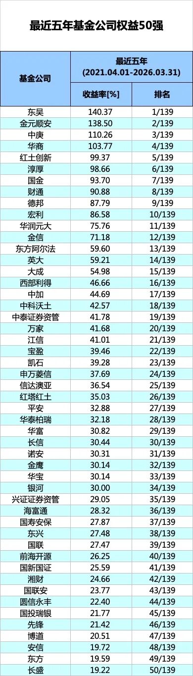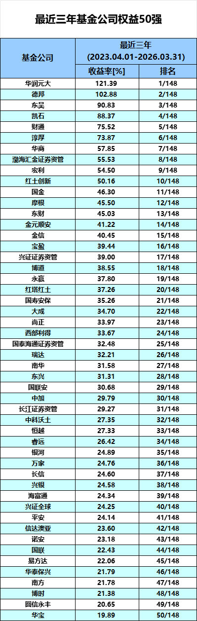国泰海通证券数据显示,从三年期(2023年4月1日到2026年3月31日)绝对收益排名看,冠军为华润元大基金,旗下主动权益类基金平均涨幅为121.39%,在148家公司中排名第一;位居第二和第三的分别是德邦、东吴,旗下主动权益类基金平均收益率分别为102.88%、90.83%;凯石、财通、淳厚、华商、渤海汇金证券资管、宏利、红土创新等公司的收益率也都超过50%。