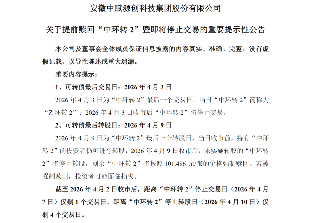 4月2日晚间,中赋科技发布关于提前赎回“中环转2”暨即将停止交易的重要提示性公告,提醒投资者4月3日为中环转2最后一个交易日,4月9日是最后一个转股日,债券持有人应及时卖出或转股。4月9日收市后,未实施转股的中环转2将全部冻结,停止交易和转股。