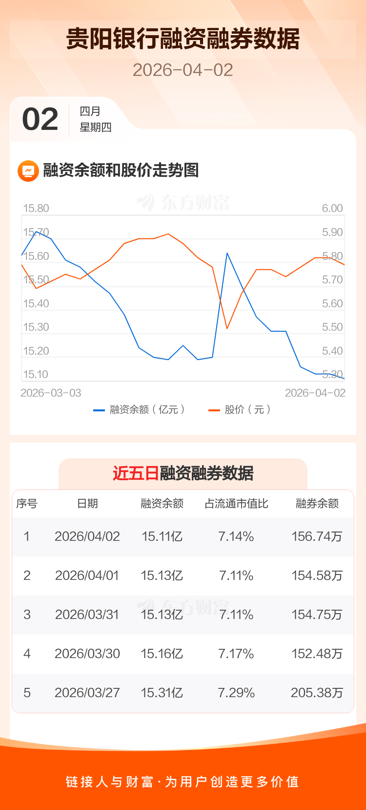 交易所最新数据显示,贵阳银行于2026年4月2日获融资买入1095.22万元,融资偿还1298.27万元,当日融资净偿还203.05万元。目前,该股融资余额15.11亿,占流通市值比例为7.14%。