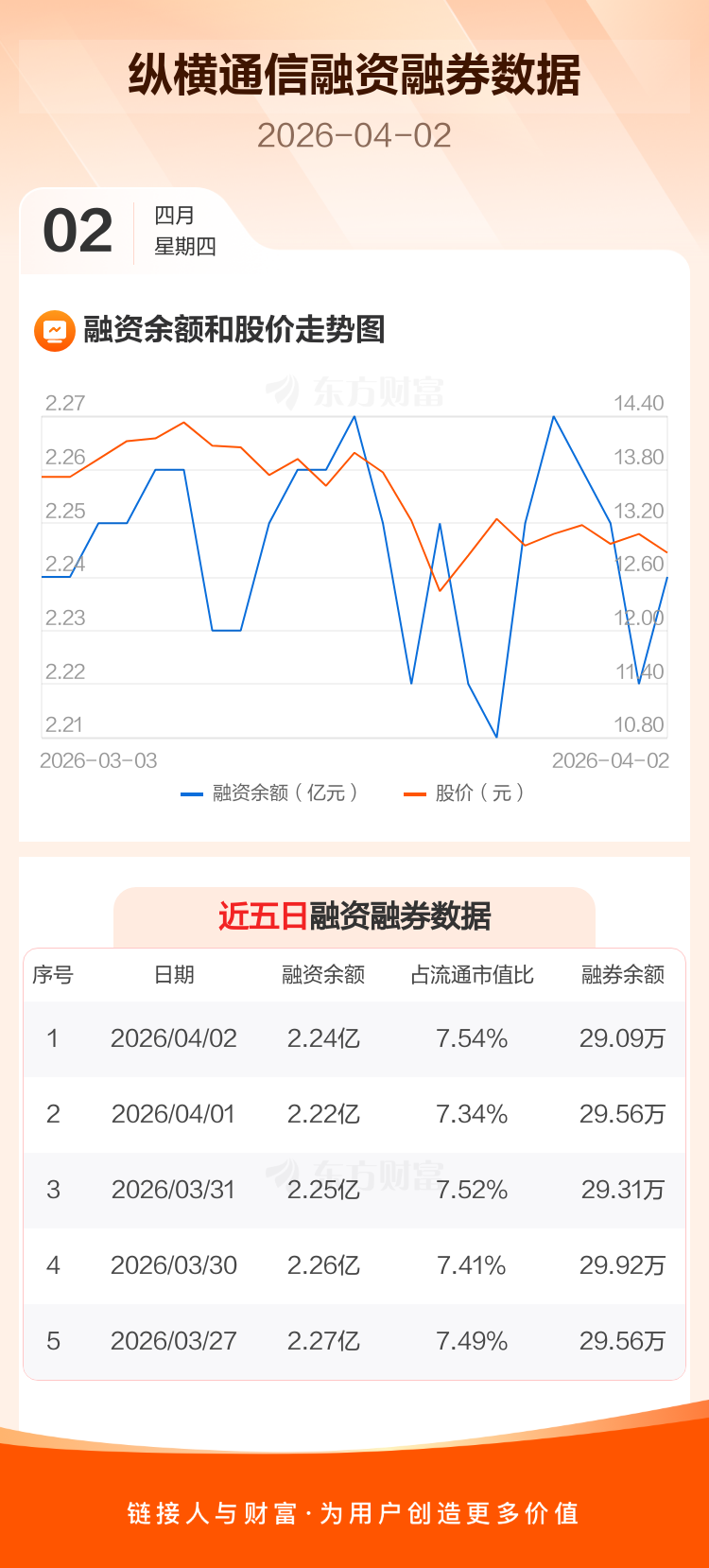 交易所最新数据显示,纵横通信于2026年4月2日获融资买入519.70万元,融资偿还270.64万元,当日融资净买入249.06万元。目前,该股融资余额2.24亿,占流通市值比例为7.54%。