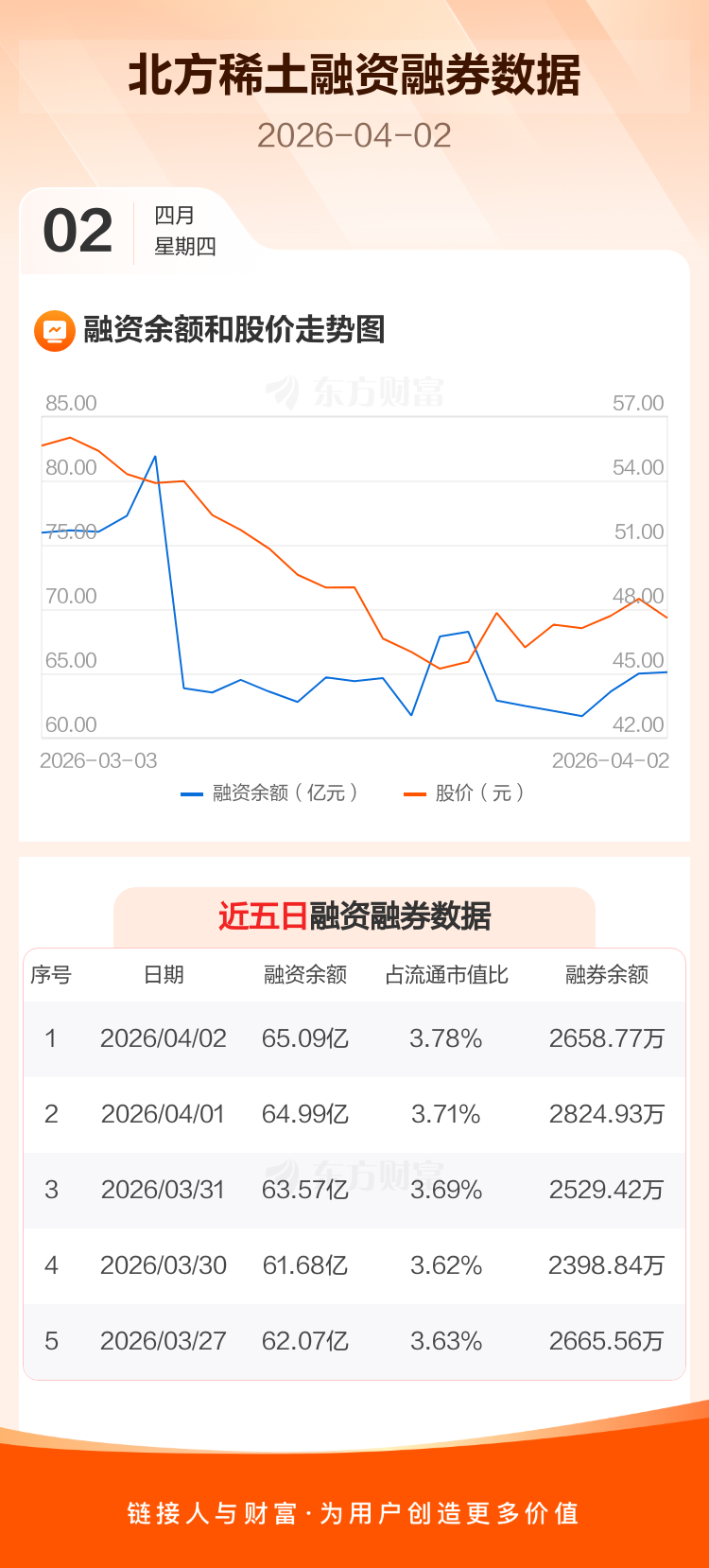 交易所最新数据显示,北方稀土于2026年4月2日获融资买入1.69亿元,融资偿还1.59亿元,当日融资净买入1027.74万元。目前,该股融资余额65.09亿,占流通市值比例为3.78%。