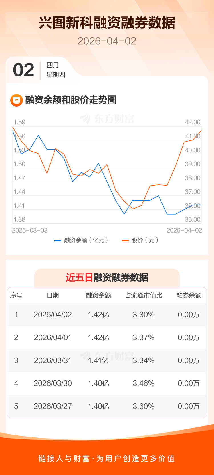 交易所最新数据显示,兴图新科于2026年4月2日获融资买入736.99万元,融资偿还827.52万元,当日融资净偿还90.53万元。目前,该股融资余额1.42亿,占流通市值比例为3.30%。