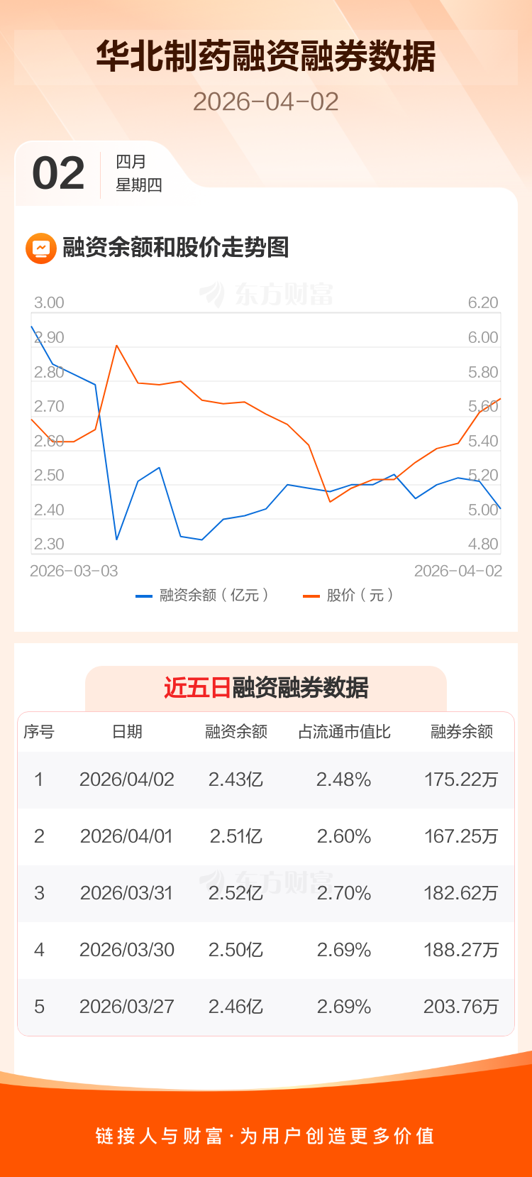 交易所最新数据显示,华北制药于2026年4月2日获融资买入2555.61万元,融资偿还3313.07万元,当日融资净偿还757.46万元。目前,该股融资余额2.43亿,占流通市值比例为2.48%。