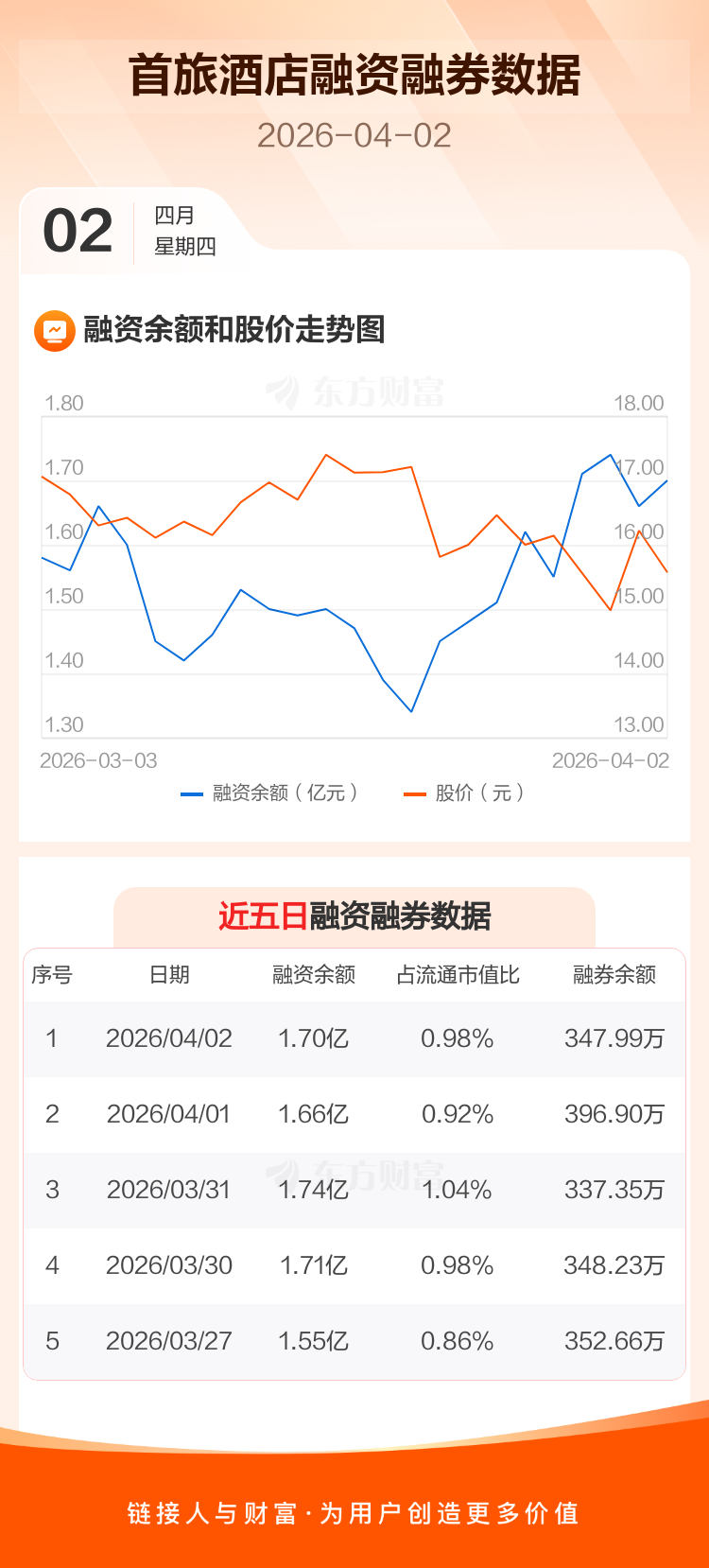 交易所最新数据显示,首旅酒店于2026年4月2日获融资买入2323.00万元,融资偿还1959.71万元,当日融资净买入363.29万元。目前,该股融资余额1.70亿,占流通市值比例为0.98%。