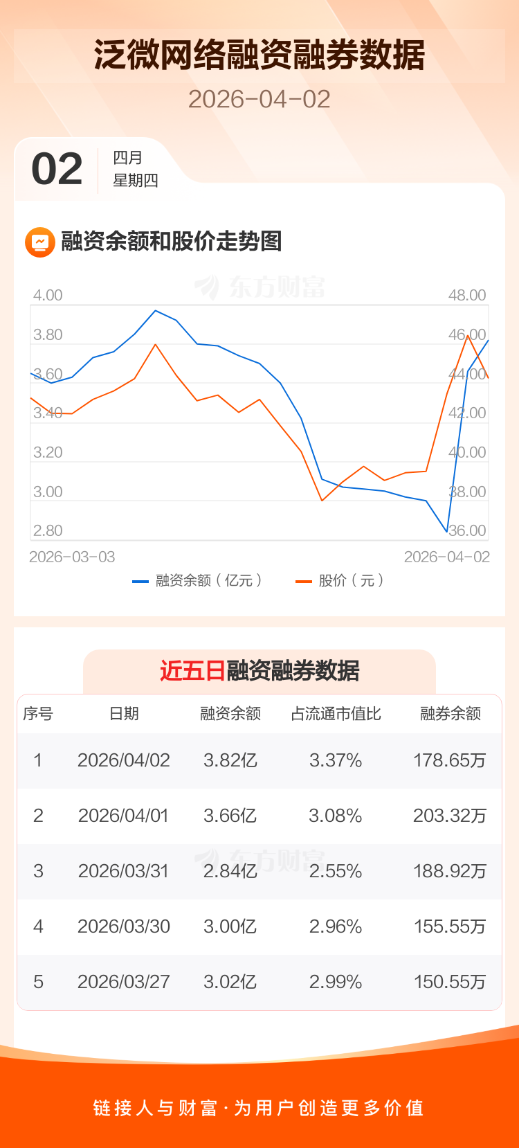 交易所最新数据显示,泛微网络于2026年4月2日获融资买入4849.48万元,融资偿还3271.56万元,当日融资净买入1577.92万元。目前,该股融资余额3.82亿,占流通市值比例为3.37%。