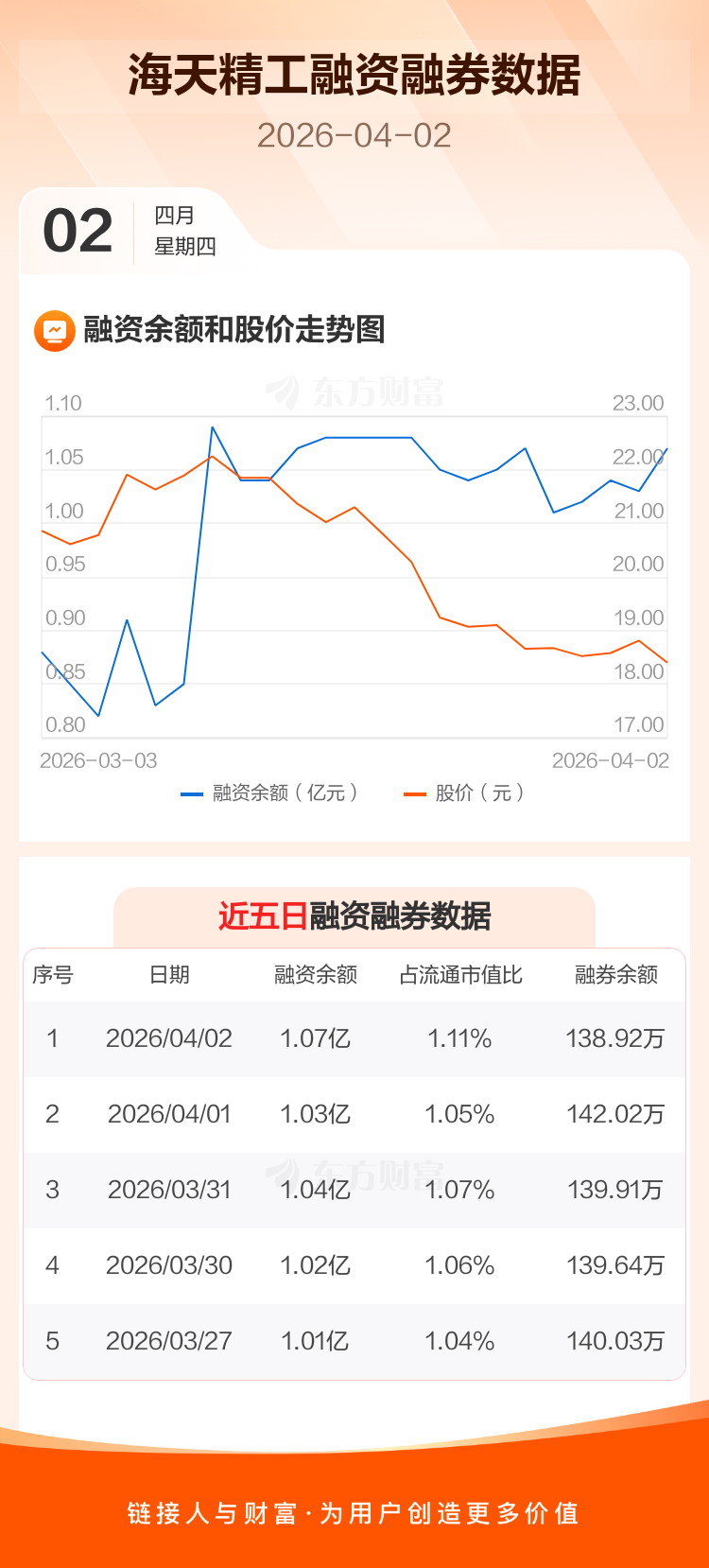 交易所最新数据显示,海天精工于2026年4月2日获融资买入614.00万元,融资偿还246.59万元,当日融资净买入367.41万元。目前,该股融资余额1.07亿,占流通市值比例为1.11%。
