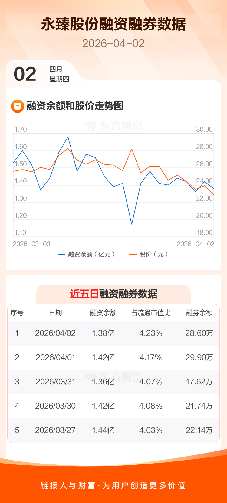 交易所最新数据显示,永臻股份于2026年4月2日获融资买入1387.54万元,融资偿还1784.51万元,当日融资净偿还396.96万元。目前,该股融资余额1.38亿,占流通市值比例为4.23%。