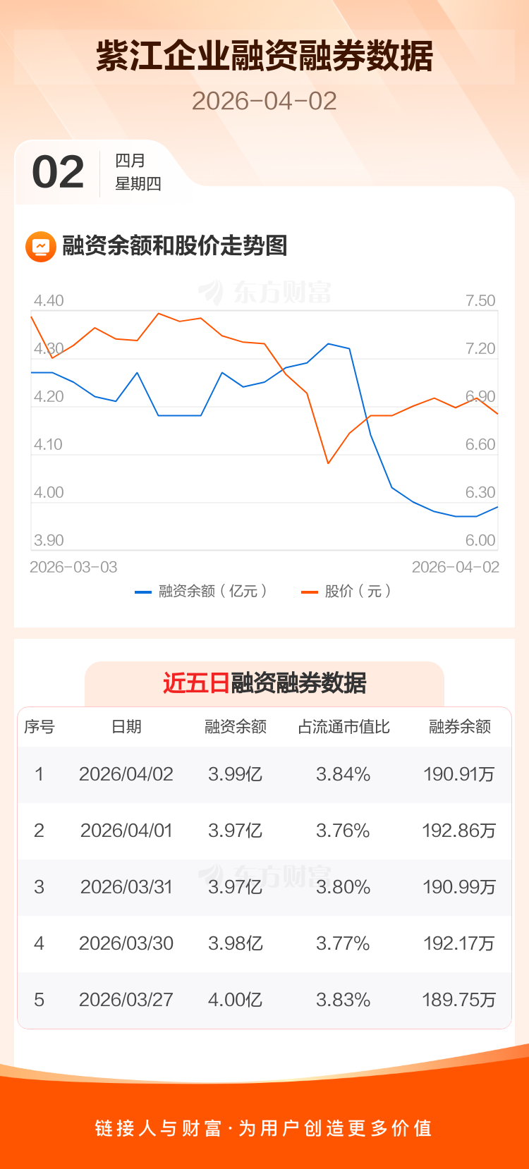 交易所最新数据显示,紫江企业于2026年4月2日获融资买入459.14万元,融资偿还268.38万元,当日融资净买入190.76万元。目前,该股融资余额3.99亿,占流通市值比例为3.84%。