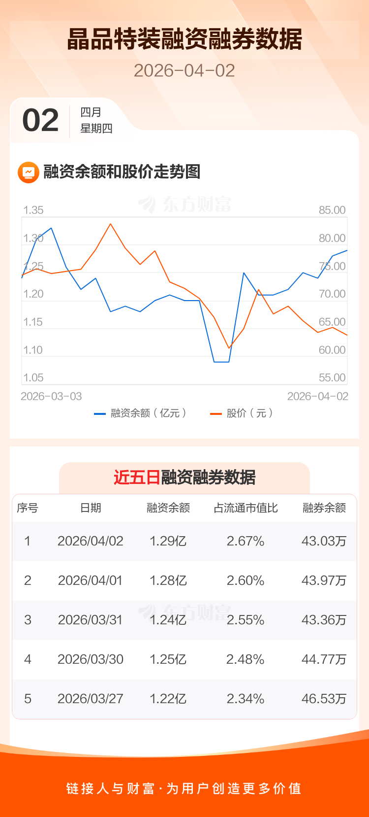 交易所最新数据显示,晶品特装于2026年4月2日获融资买入713.34万元,融资偿还687.62万元,当日融资净买入25.72万元。目前,该股融资余额1.29亿,占流通市值比例为2.67%。