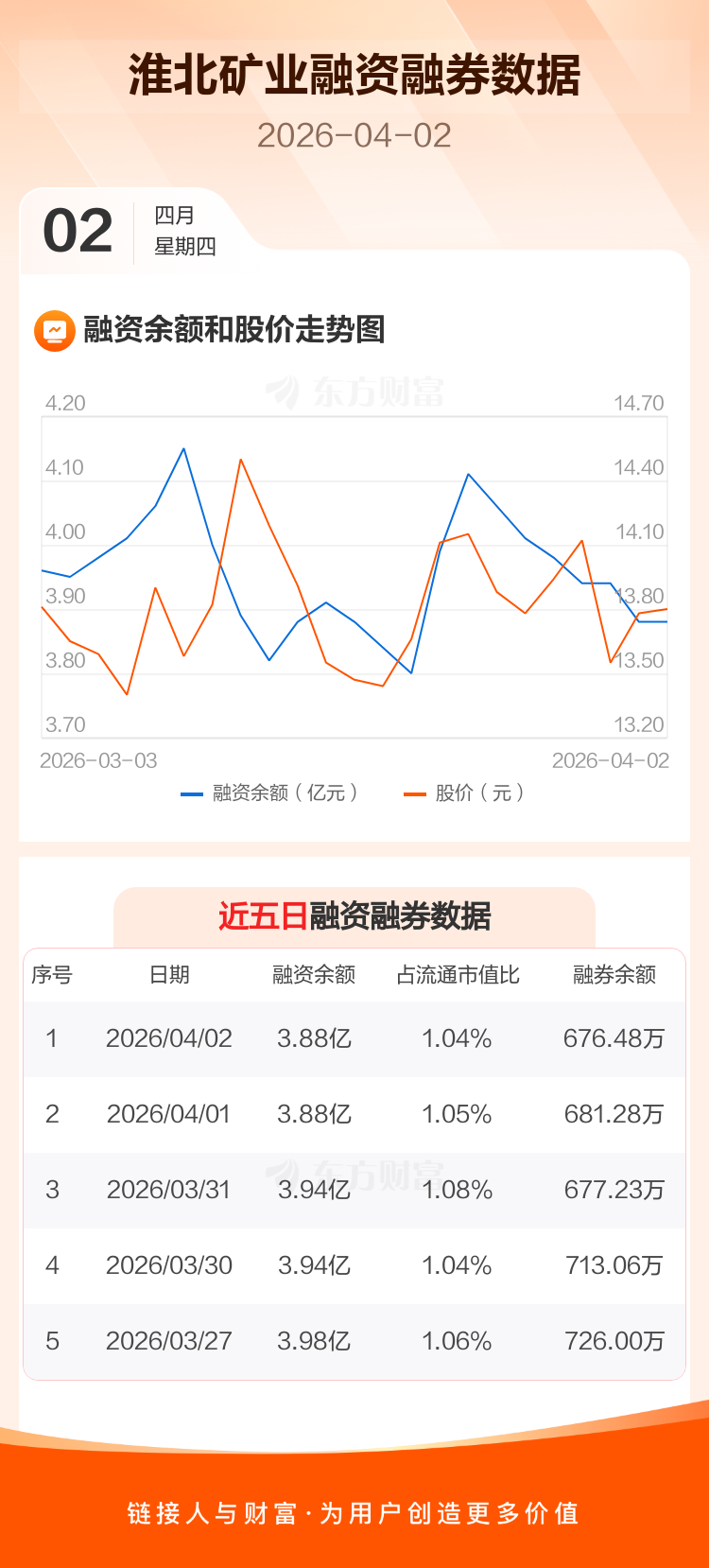 交易所最新数据显示,淮北矿业于2026年4月2日获融资买入1280.07万元,融资偿还1306.73万元,当日融资净偿还26.65万元。目前,该股融资余额3.88亿,占流通市值比例为1.04%。