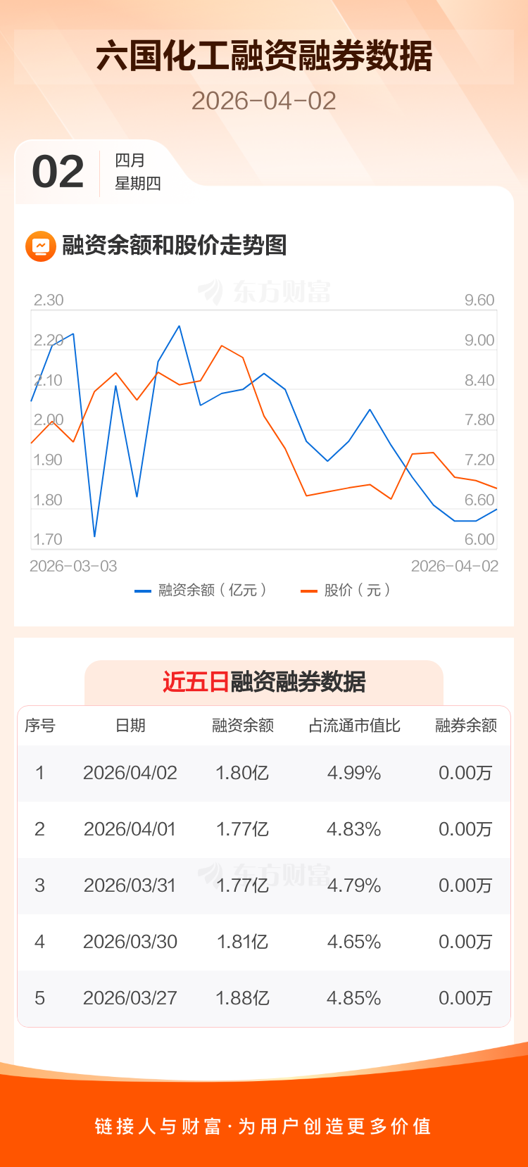 交易所最新数据显示,六国化工于2026年4月2日获融资买入1606.78万元,融资偿还1351.35万元,当日融资净买入255.43万元。目前,该股融资余额1.80亿,占流通市值比例为4.99%。