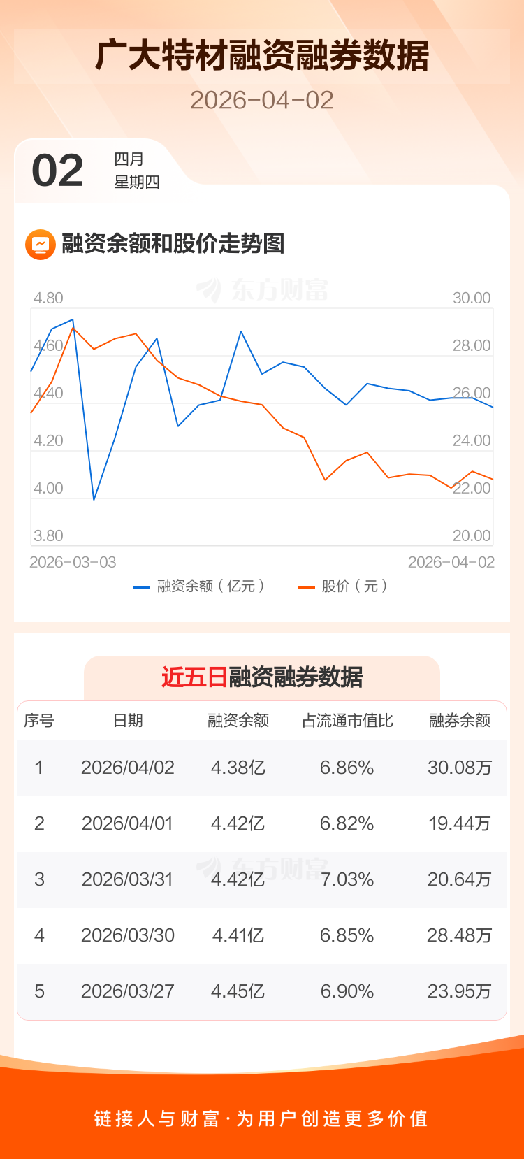 交易所最新数据显示,广大特材于2026年4月2日获融资买入1083.93万元,融资偿还1457.88万元,当日融资净偿还373.94万元。目前,该股融资余额4.38亿,占流通市值比例为6.86%。