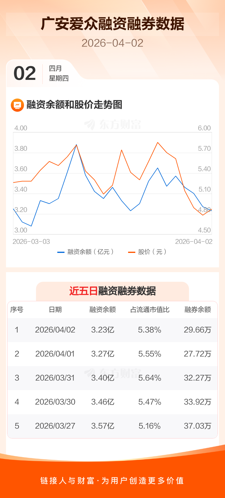 交易所最新数据显示,广安爱众于2026年4月2日获融资买入3741.13万元,融资偿还4111.04万元,当日融资净偿还369.91万元。目前,该股融资余额3.23亿,占流通市值比例为5.38%。