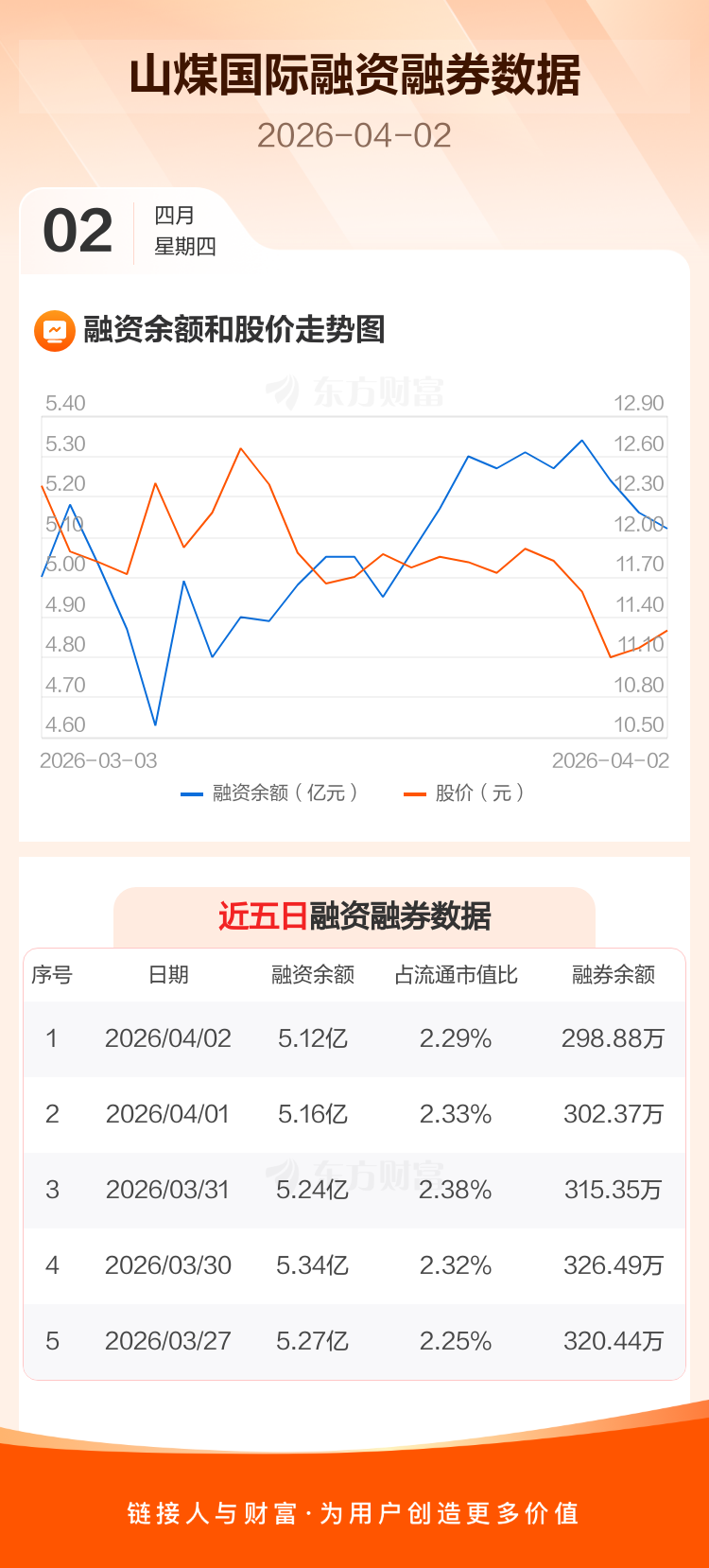 交易所最新数据显示,山煤国际于2026年4月2日获融资买入1629.01万元,融资偿还1968.30万元,当日融资净偿还339.29万元。目前,该股融资余额5.12亿,占流通市值比例为2.29%。