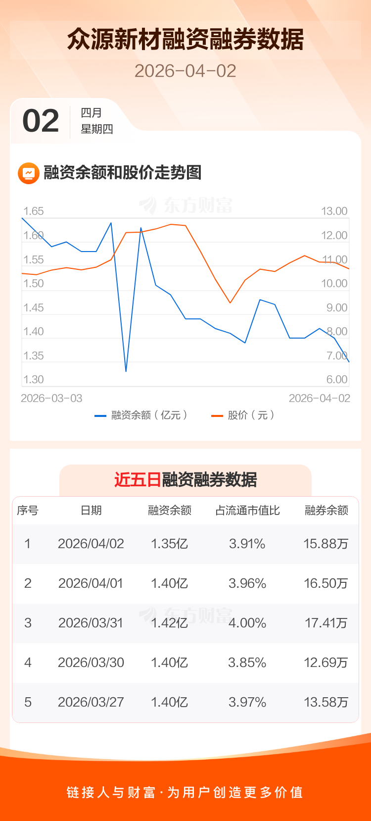 交易所最新数据显示,众源新材于2026年4月2日获融资买入508.53万元,融资偿还1045.97万元,当日融资净偿还537.44万元。目前,该股融资余额1.35亿,占流通市值比例为3.91%。