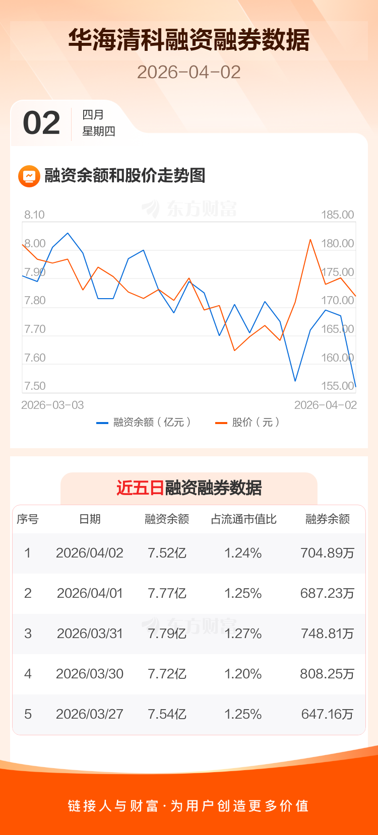 交易所最新数据显示,华海清科于2026年4月2日获融资买入1285.90万元,融资偿还3806.15万元,当日融资净偿还2520.25万元。目前,该股融资余额7.52亿,占流通市值比例为1.24%。