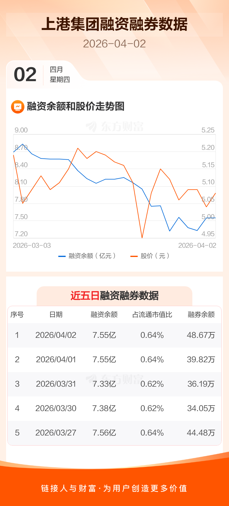 交易所最新数据显示,上港集团于2026年4月2日获融资买入3151.17万元,融资偿还3120.04万元,当日融资净买入31.13万元。目前,该股融资余额7.55亿,占流通市值比例为0.64%。