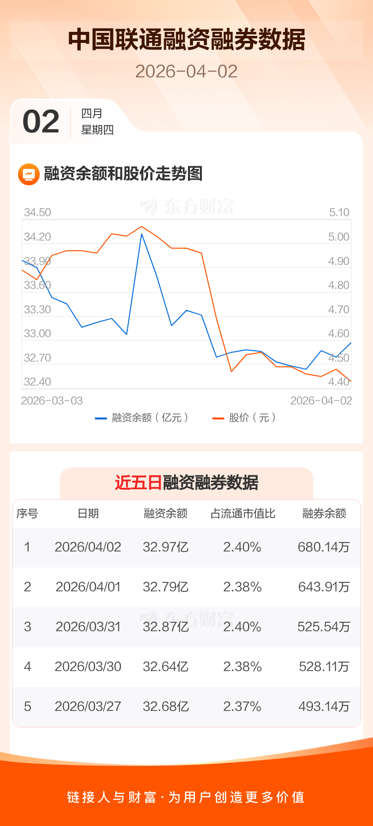 交易所最新数据显示,中国联通于2026年4月2日获融资买入6447.77万元,融资偿还4574.43万元,当日融资净买入1873.34万元。目前,该股融资余额32.97亿,占流通市值比例为2.40%。