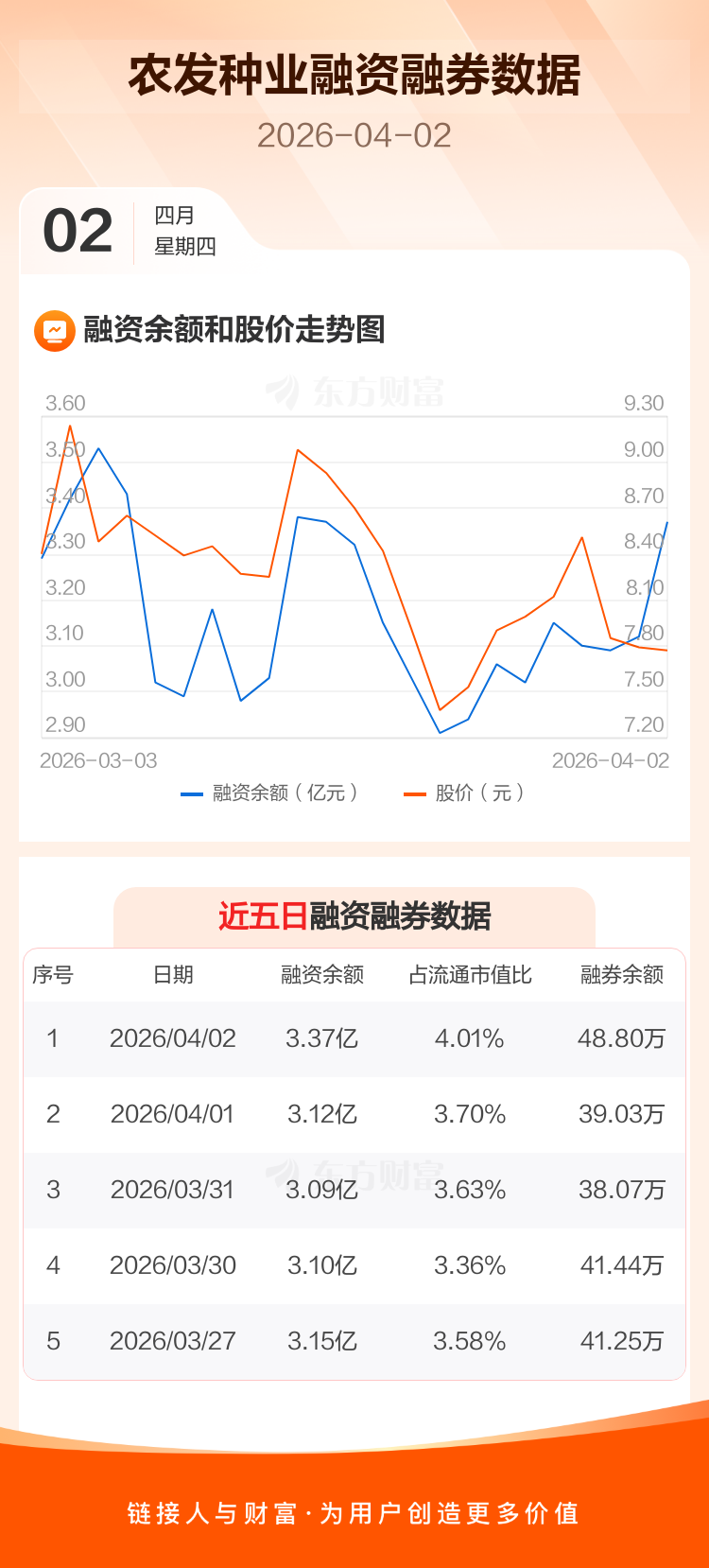 交易所最新数据显示,农发种业于2026年4月2日获融资买入5777.07万元,融资偿还3270.31万元,当日融资净买入2506.76万元。目前,该股融资余额3.37亿,占流通市值比例为4.01%。