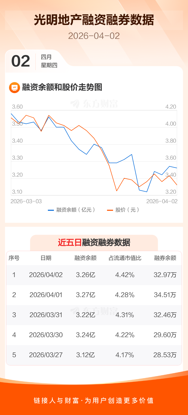 交易所最新数据显示,光明地产于2026年4月2日获融资买入703.52万元,融资偿还738.83万元,当日融资净偿还35.31万元。目前,该股融资余额3.26亿,占流通市值比例为4.42%。