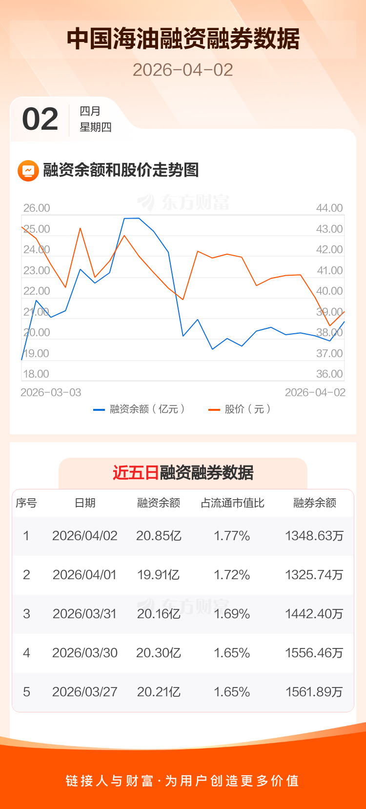 交易所最新数据显示,中国海油于2026年4月2日获融资买入2.80亿元,融资偿还1.85亿元,当日融资净买入9432.99万元。目前,该股融资余额20.85亿,占流通市值比例为1.77%。
