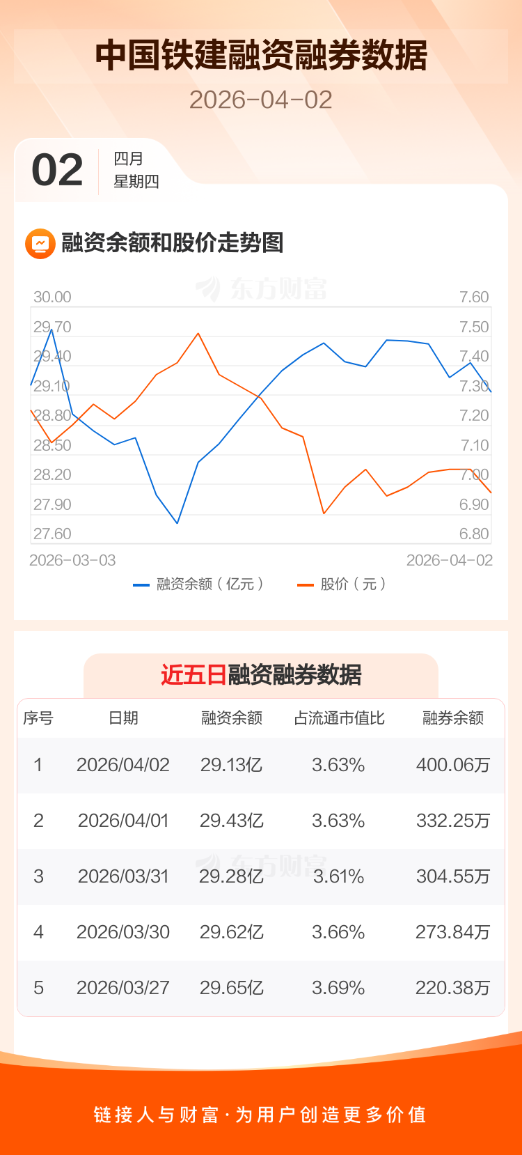 交易所最新数据显示,中国铁建于2026年4月2日获融资买入6051.05万元,融资偿还9104.57万元,当日融资净偿还3053.53万元。目前,该股融资余额29.13亿,占流通市值比例为3.63%。