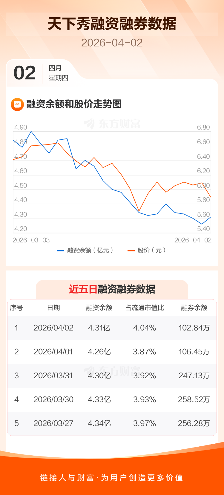 交易所最新数据显示,天下秀于2026年4月2日获融资买入1429.26万元,融资偿还994.90万元,当日融资净买入434.36万元。目前,该股融资余额4.31亿,占流通市值比例为4.04%。