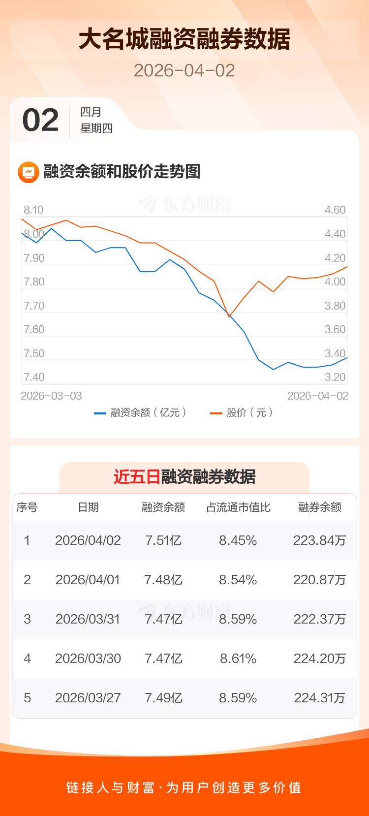 交易所最新数据显示,大名城于2026年4月2日获融资买入1013.37万元,融资偿还732.67万元,当日融资净买入280.7万元。目前,该股融资余额7.51亿,占流通市值比例为8.45%。