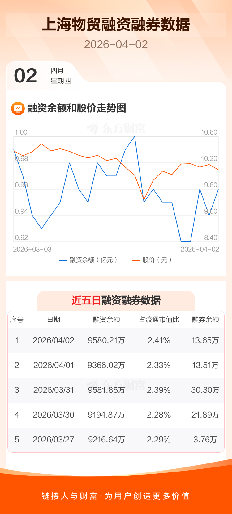 交易所最新数据显示,上海物贸于2026年4月2日获融资买入424.72万元,融资偿还210.53万元,当日融资净买入214.19万元。目前,该股融资余额9580.21万,占流通市值比例为2.41%。
