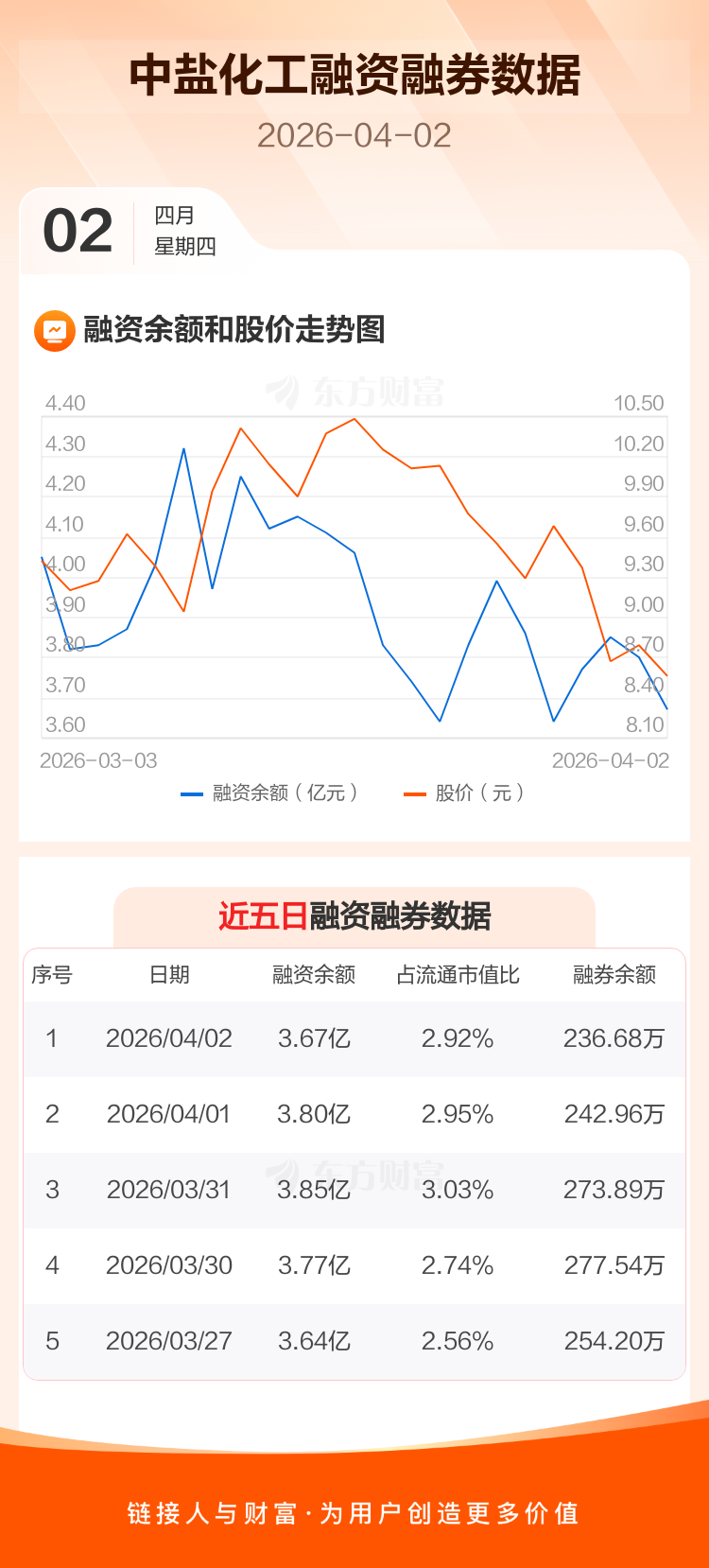 交易所最新数据显示,中盐化工于2026年4月2日获融资买入2235.21万元,融资偿还3491.32万元,当日融资净偿还1256.11万元。目前,该股融资余额3.67亿,占流通市值比例为2.92%。