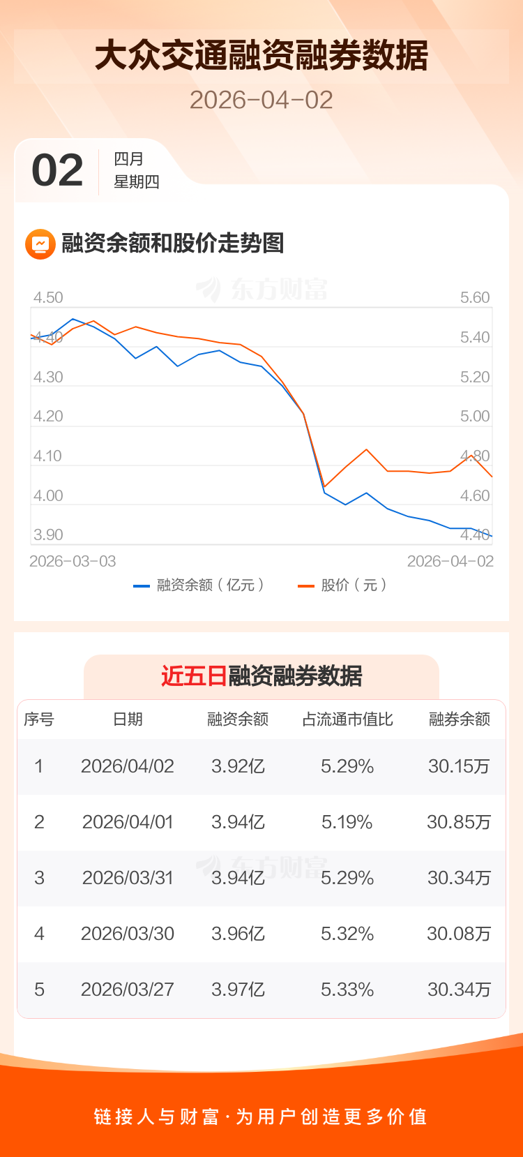 交易所最新数据显示,大众交通于2026年4月2日获融资买入429.80万元,融资偿还585.96万元,当日融资净偿还156.16万元。目前,该股融资余额3.92亿,占流通市值比例为5.29%。