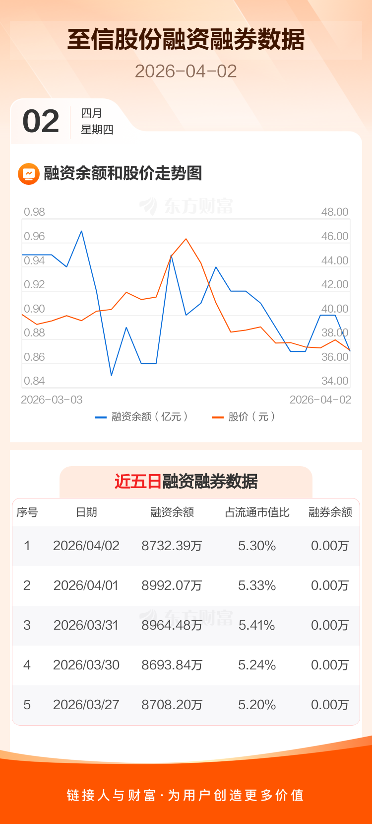 交易所最新数据显示,至信股份于2026年4月2日获融资买入264.66万元,融资偿还524.34万元,当日融资净偿还259.68万元。目前,该股融资余额8732.39万,占流通市值比例为5.30%。