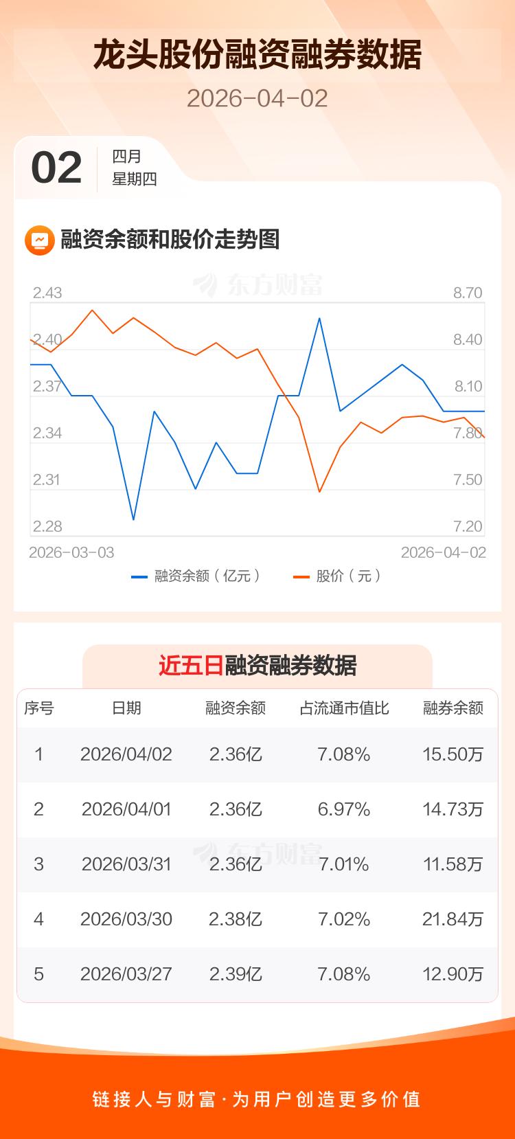 交易所最新数据显示,龙头股份于2026年4月2日获融资买入345.38万元,融资偿还344.15万元,当日融资净买入1.24万元。目前,该股融资余额2.36亿,占流通市值比例为7.08%。