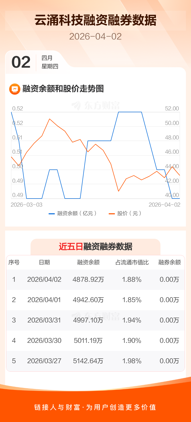 交易所最新数据显示,云涌科技于2026年4月2日获融资买入140.44万元,融资偿还204.12万元,当日融资净偿还63.68万元。目前,该股融资余额4878.92万,占流通市值比例为1.88%。