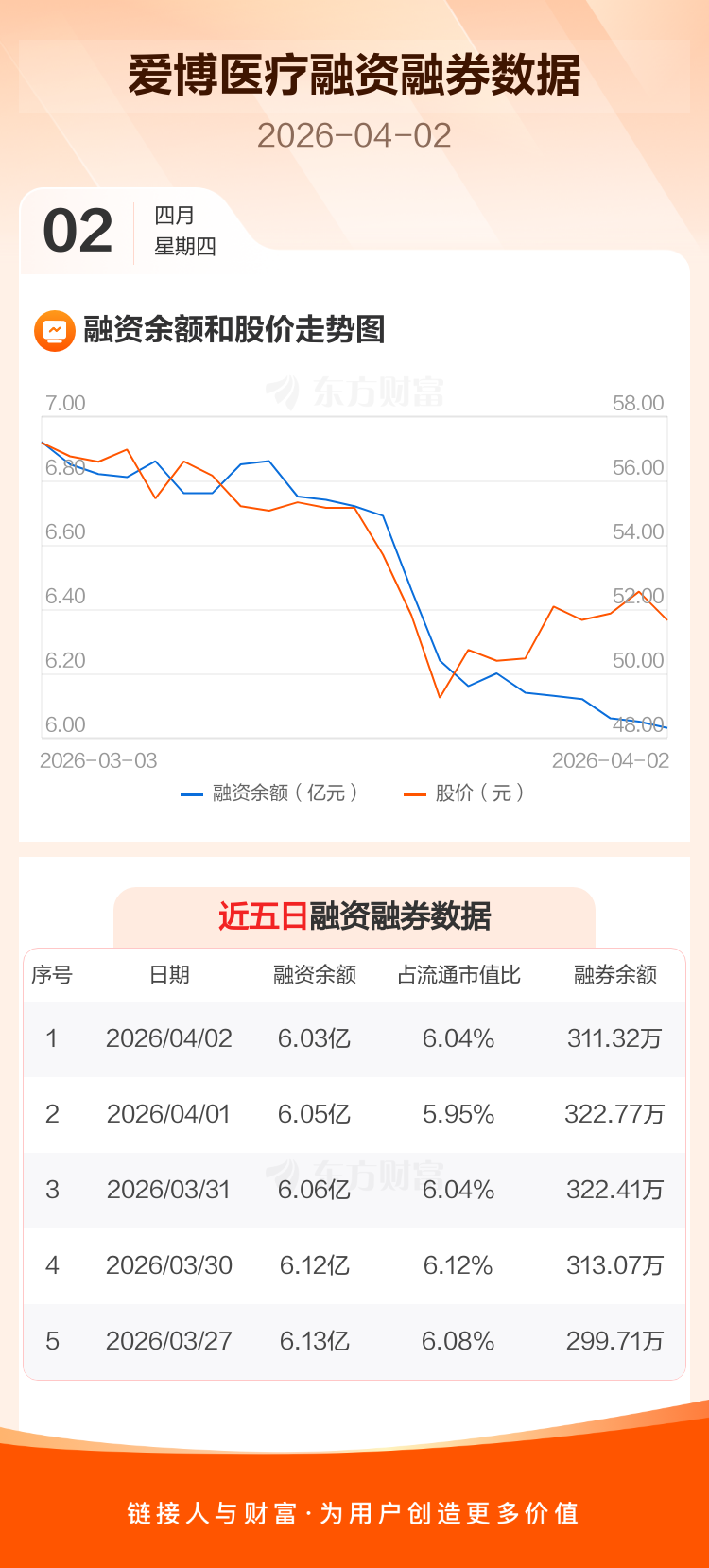 交易所最新数据显示,爱博医疗于2026年4月2日获融资买入447.62万元,融资偿还594.19万元,当日融资净偿还146.57万元。目前,该股融资余额6.03亿,占流通市值比例为6.04%。